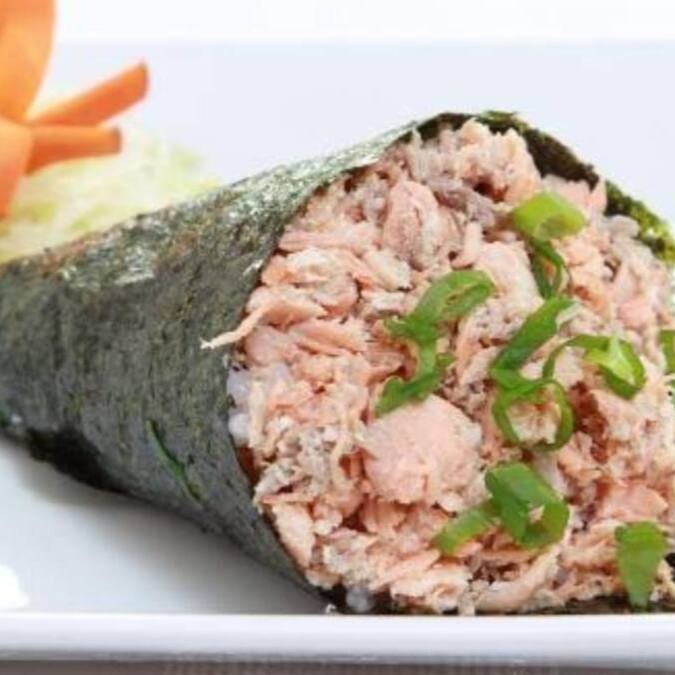 Esse e nosso temaki de salmao gralhado, muito bom para quem ainda nao esta acostumado com o salmao cru, uma excelente opcao. Acompanha 1 shoyo, 1 Teriaki, 1 par de hashi