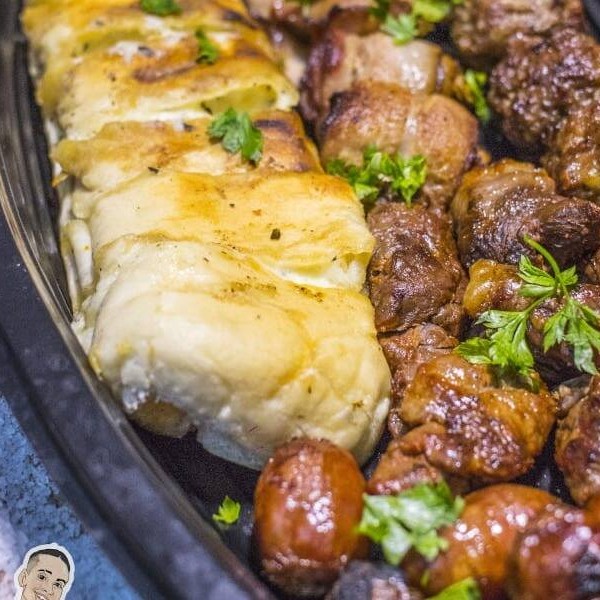 Nossa queridinha vem com 1 pão de alho com queijo, 1 espetinho linguicinha aperitivo alemã, 1 espetinho de almôndega recheada com mussarela, 1 espetinho de medalhão de coração,1 fraldinha desmanchando, 1 asa recheada com presunto e mussarela . Acompanha 1 delicioso molho Sweet sauce e farofa
