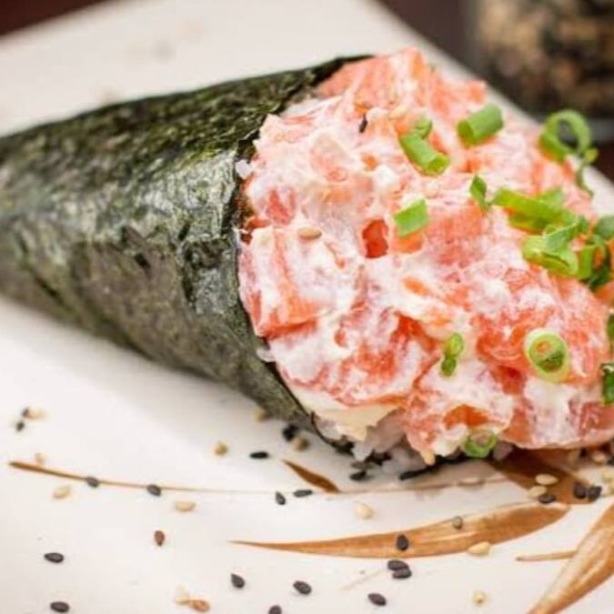 Esse e nosso delicioso temaki fildelfia, feito com salmao , cream chesse e cebolinha, arroz japones e alga. Acompanha 1 shoyo , e 1 teriaki, e 1 par de hashi.
