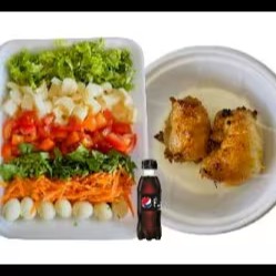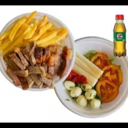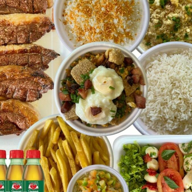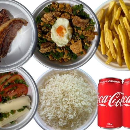 01 arroz neve - 01 tropeiro - 01 fritas 01 salada (alface, tomate, tomate seco, ovo de codorna e palmito) - 0,250 gr picanha 02 coca cola lata obs: se precisar de talheres, favor inserir no pedido.