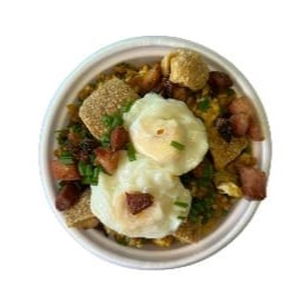 01 porção farofa com ovos na manteiga, 01 molho de vinagrete, 01 batata frita, 01 porção de arroz neve, 01 porção de arroz ao alho