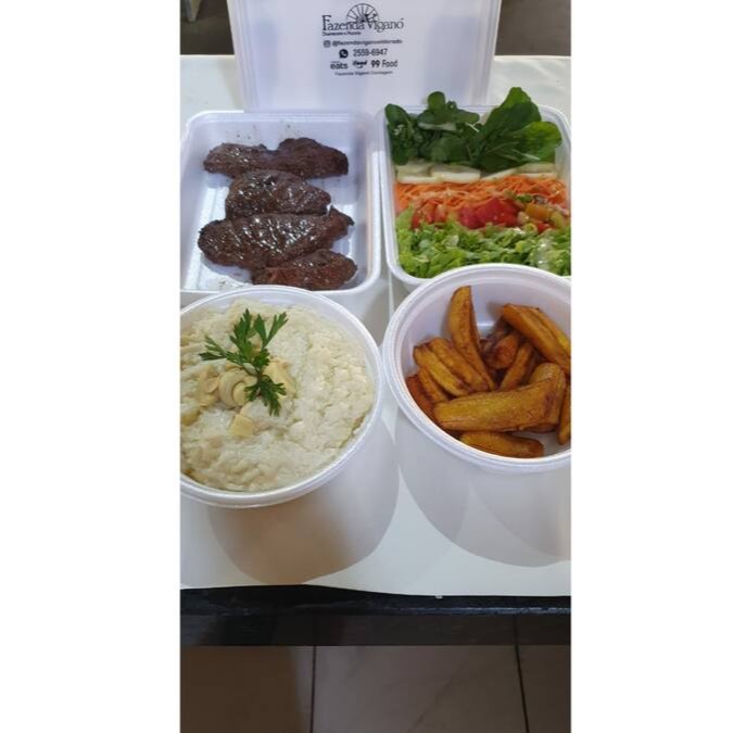 150 gr baby bife, Arroz neve, feijão tropeiro, batata frita + Salada separada(alface, tomate, palmito e ovo de codorna) - Obs: Não separamos ítens,se precisar de talheres, favor inserir no pedido.
