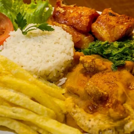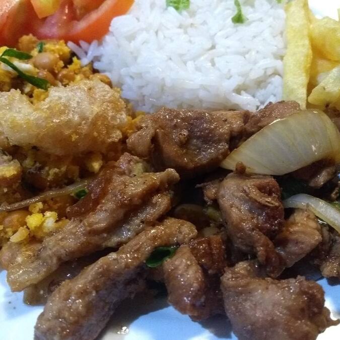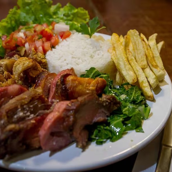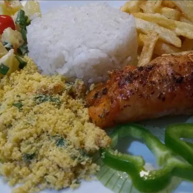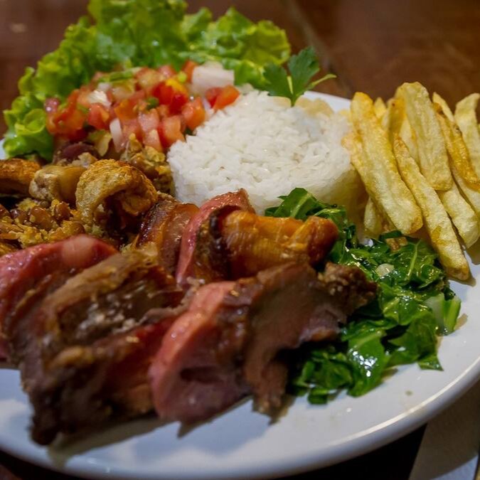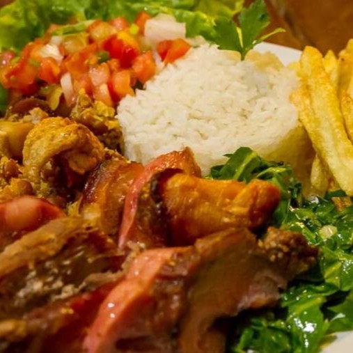 Churrasco misto (pernil e linguiça- 140g), arroz branco, feijão tropeiro, fritas, alface crespa e vinagre.