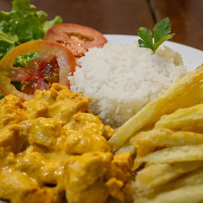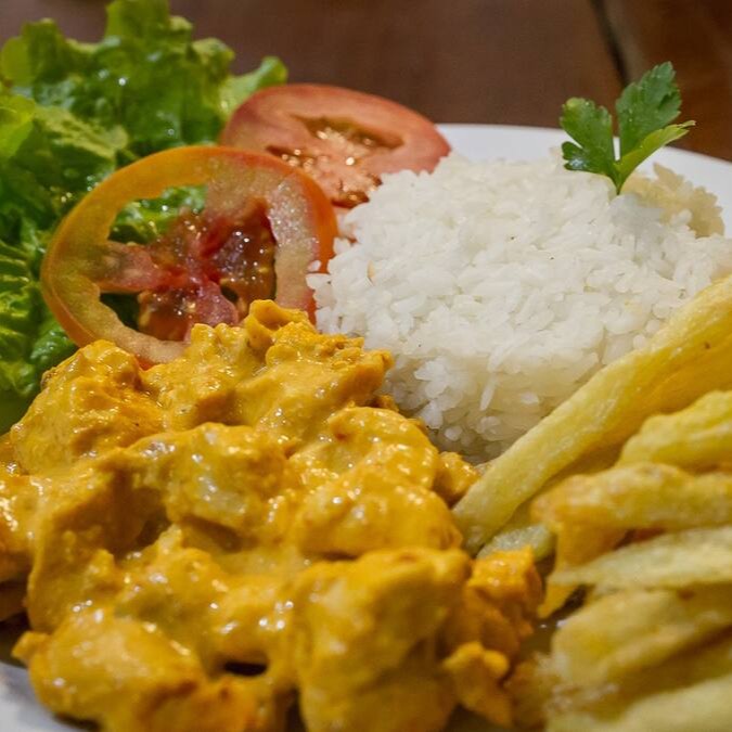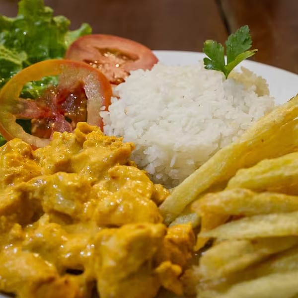 Arroz branco, strogonoff de frango (150g), batata frita, alface e tomate