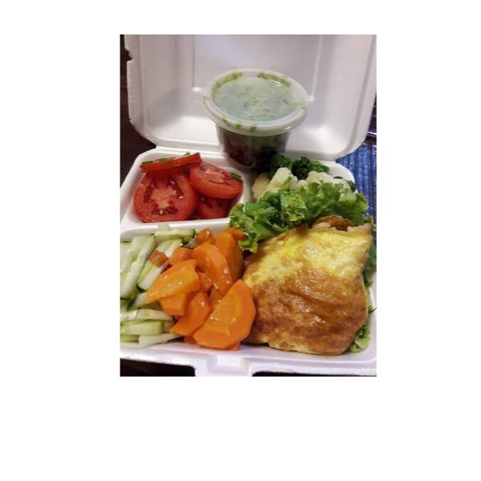 Omelete especial( prezunto e mussarela) e saladas( alface, tomate, beterraba, cenoura e brocolis)
