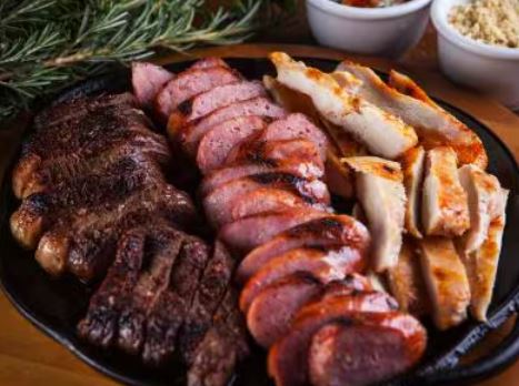 150 gramas de churrasco de alcatra, linguiça e lombo
