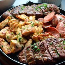 Churrasco De Alcatra, Lombo E Linguiça (120g), Arroz, Feijão, Farofa E Batata Frita