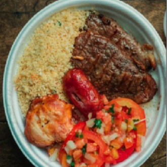 Arroz, Feijão, Farofa, Batata Frita, 150 Gramas De Churrasco De Alcatra, Linguiça, Medalhão De Frango E Vinagrete Separado