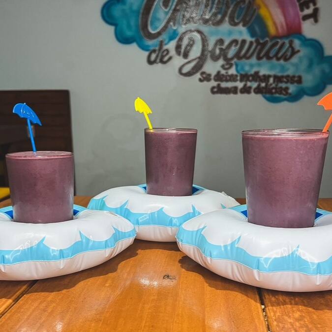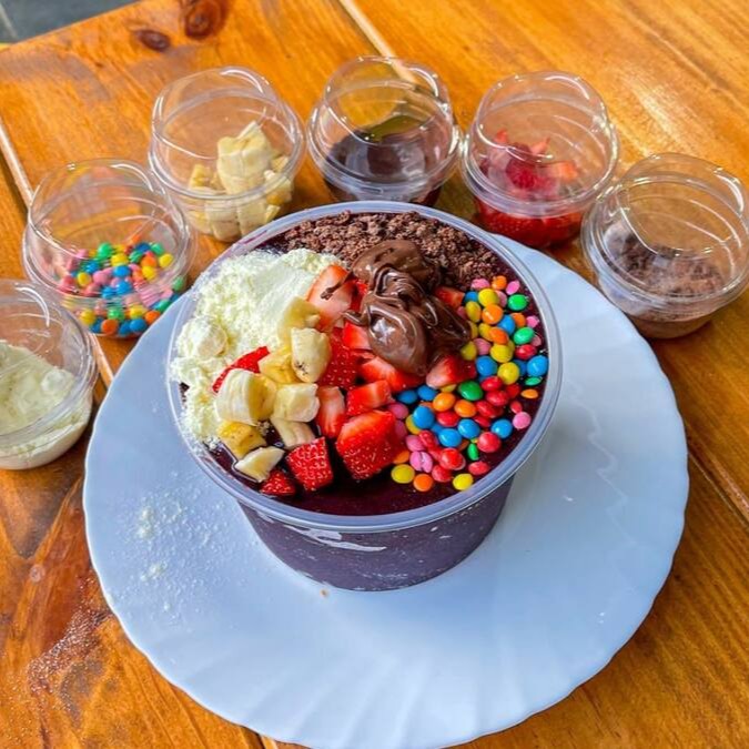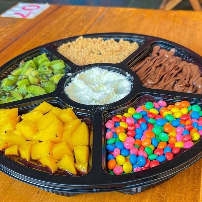Açaí, leite condensado, leite em pó, brigadeiro branco, chantilly, Bis duplo, bombom, Nutella, Mm.