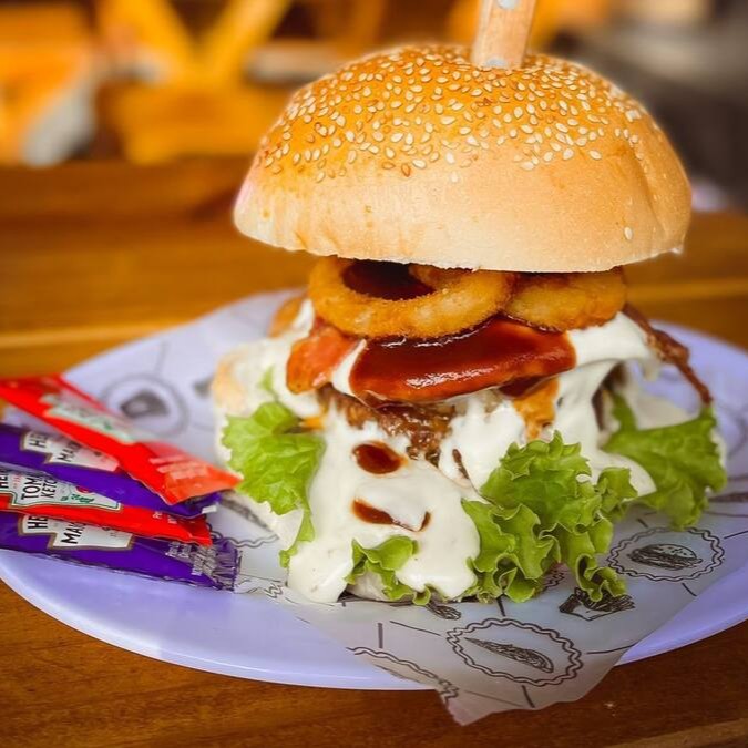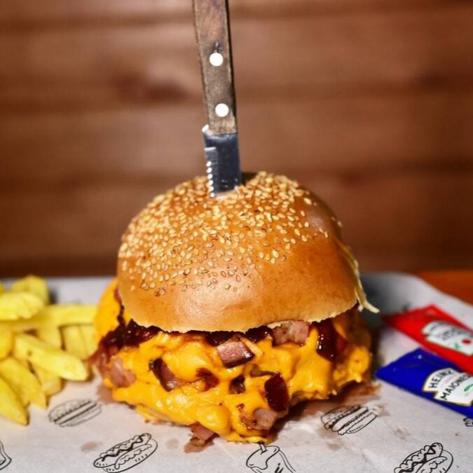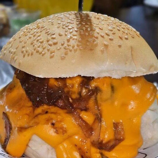 Suculento hambúrguer. Contém, Pão mergulhado no cheddar cremoso, hambúrguer artesanal ,bacon em cubos, molho da casa, e cebola caramelizada.