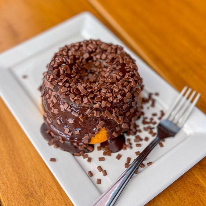 Bolo pequeno, redondo. Acompanha calda de chocolate e granule.