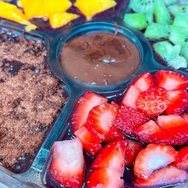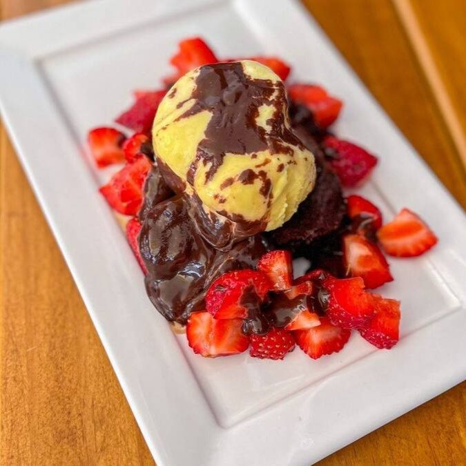 Brownie, morangos, 1 pote de brigadeiro mole, 1 bola de sorvete de creme.