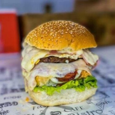 Suculento hambúrguer. Contém, Pão, 2 Hambúrgueres, ovo, bacon, presunto, muçarela, Alface,Tomate Milho,Batata Palha e Molho Especial.