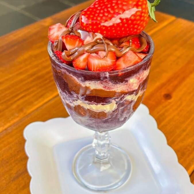 Camadas de açaí, leite condensado, leite em pó, Nutella, morango.