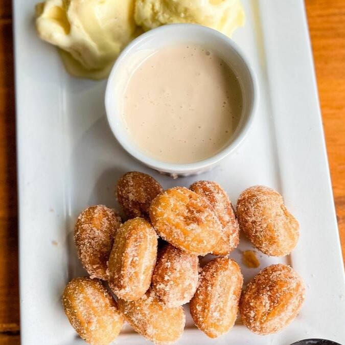 12 unidades de churros, 2 bolas de sorvete de creme, 1 pote de creme doçura de doce de leite.