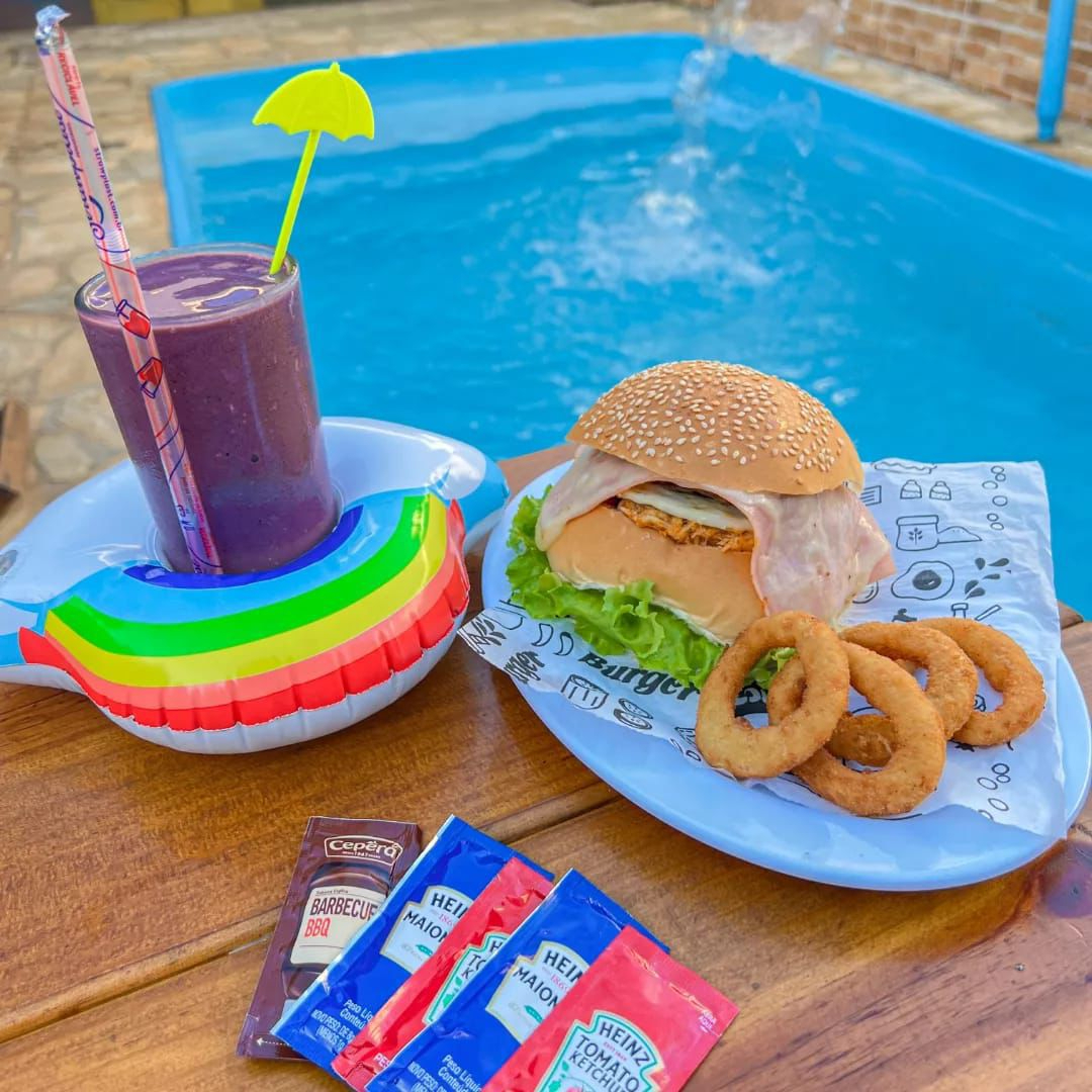 Suculento hambúrguer. Contém, Pão selado na manteiga, alface, molho especial da casa, milho, hambúrguer artesanal 140 gramas, fatia de abacaxi, ovo, Catupiry cremoso, bacon fatiado, molho barbecue e anéis de cebola.