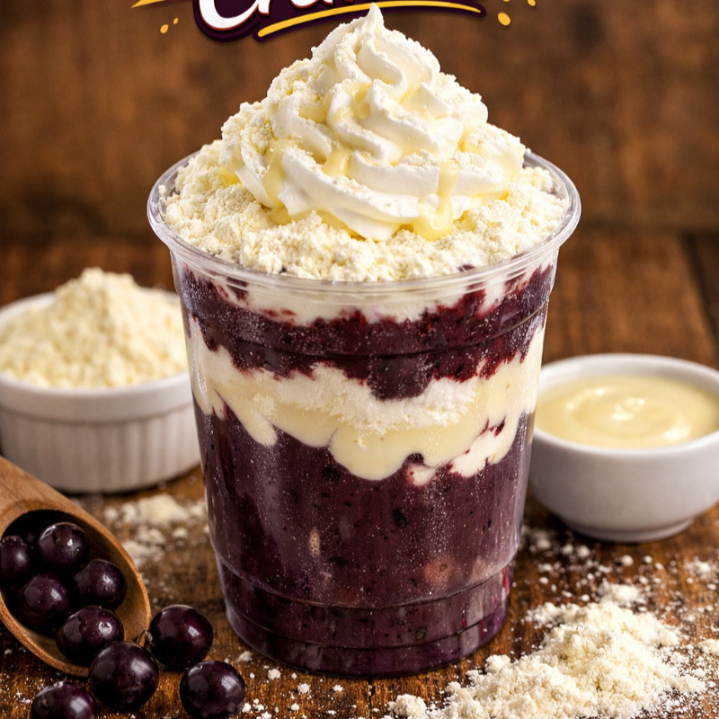 A combinação perfeita: açaí puro com aquele toque especial de leite condensado, o sabor marcante do leite em pó, a banana fresquinha que dá o equilíbrio ideal e a granola crocante pra fechar com chave de ouro!