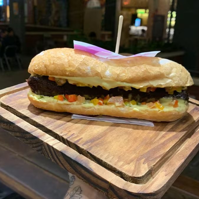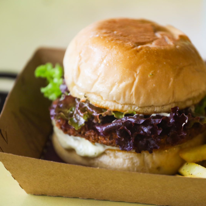 Pão brioche vegano, hambúrguer de grão de bico, maionese de alho e limão (vegana), cebola roxa, picles de pimenta jalapeño e mix de folhas.