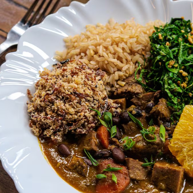 Feijuca feita com feijão preto, legumes e proteína de soja acompanha guarnições de arroz integral, couve refogada ao alho e farofa caseira de cebola.