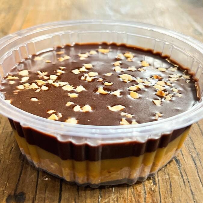 Torta à base de oleaginosas, com caramelo de côco e ganache de chocolate meio amargo. Vegana. Aproximadamente 120g
