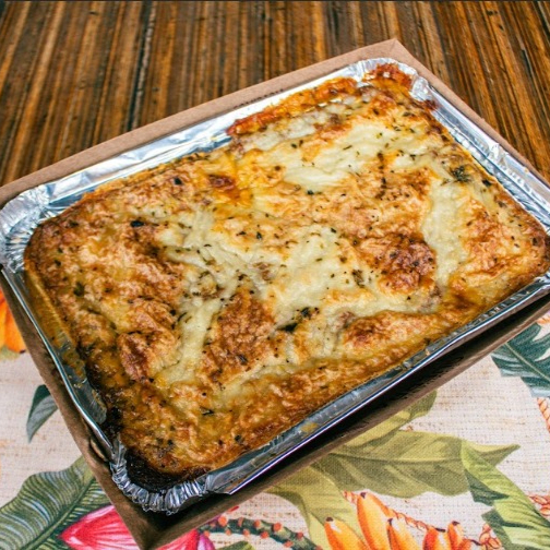 Lasanha à bolonhesa de soja com queijo de castanha. Produto vegano.