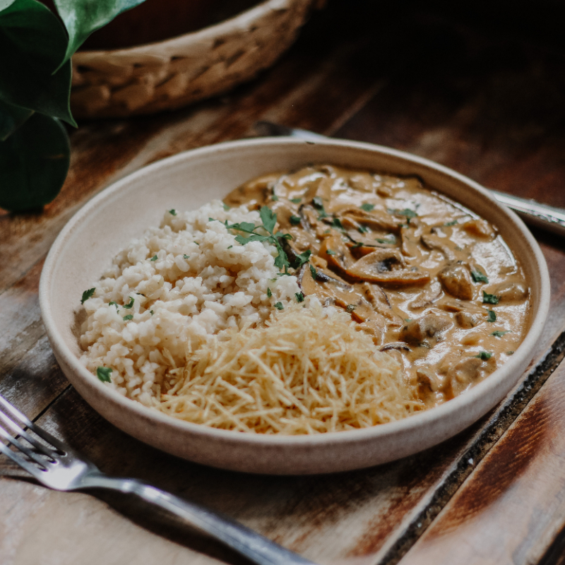 arroz integral, batata palha e estrogonofe de cogumelos com creme de leite de castanha. Prato Vegano.