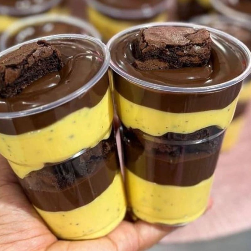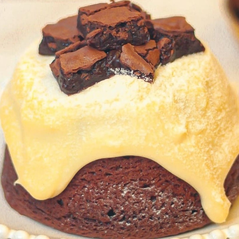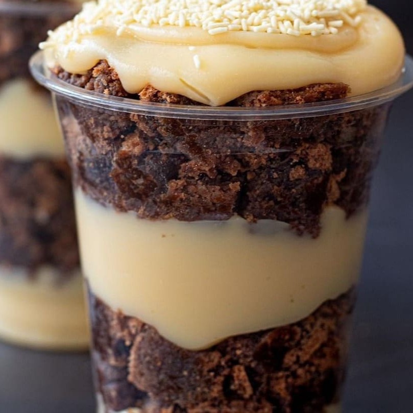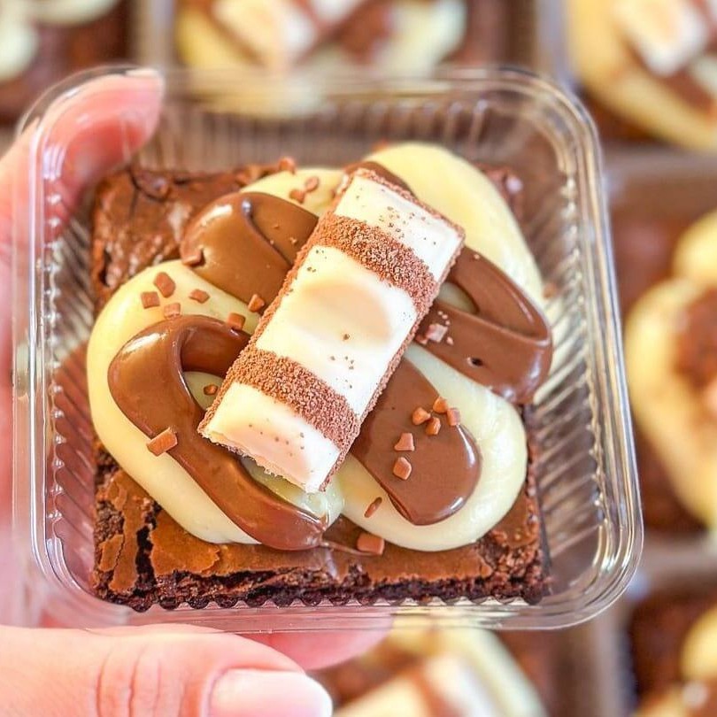 Brownie macio com camadas generosas de creme e cobertura de chocolate. Uma sobremesa intensa e irresistível.