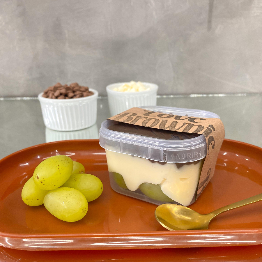 Uvas frescas picadas, brigadeiro cremoso de Ninho e brigadeiro cremoso de chocolate. (pote 150ml)