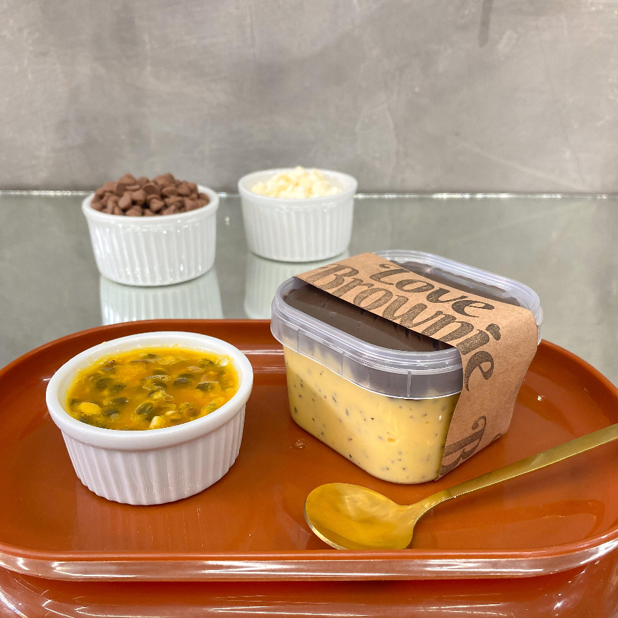 Mousse de maracujá com brigadeiro cremoso de chocolate. (pote 150ml)