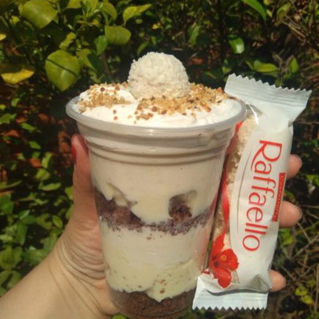 Delicioso creme de chocolate branco com coco, finalizado com ujm bombom Rafaello em cima