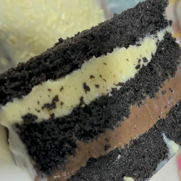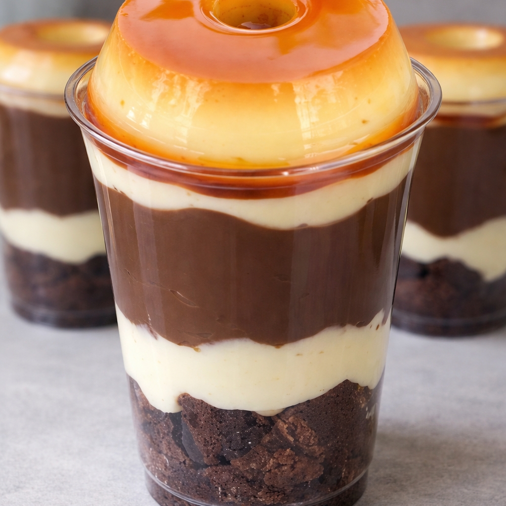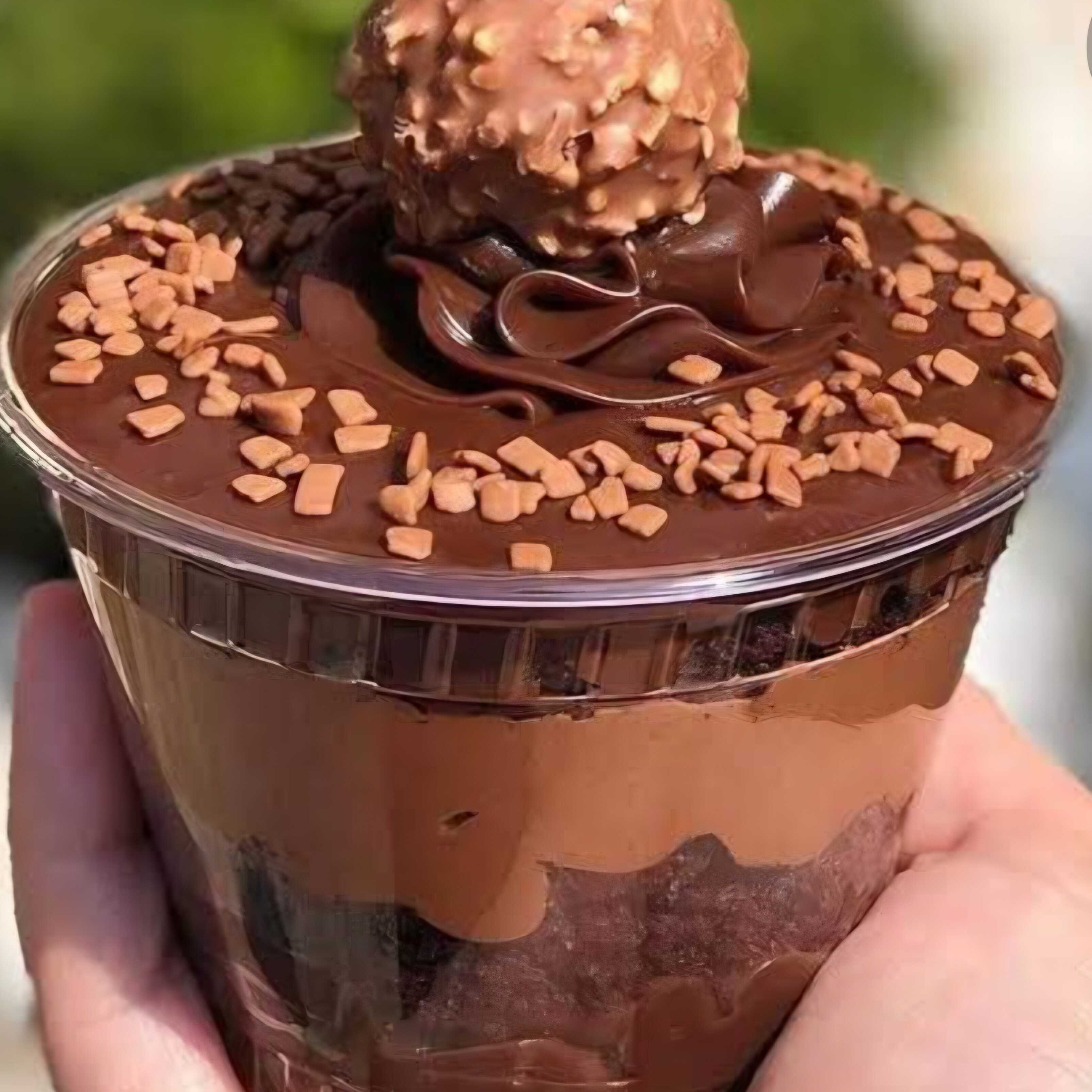 brownie, mousse de ninho, creme de ninho, nutella, creme de brigadeiro e finlizado com um pudim