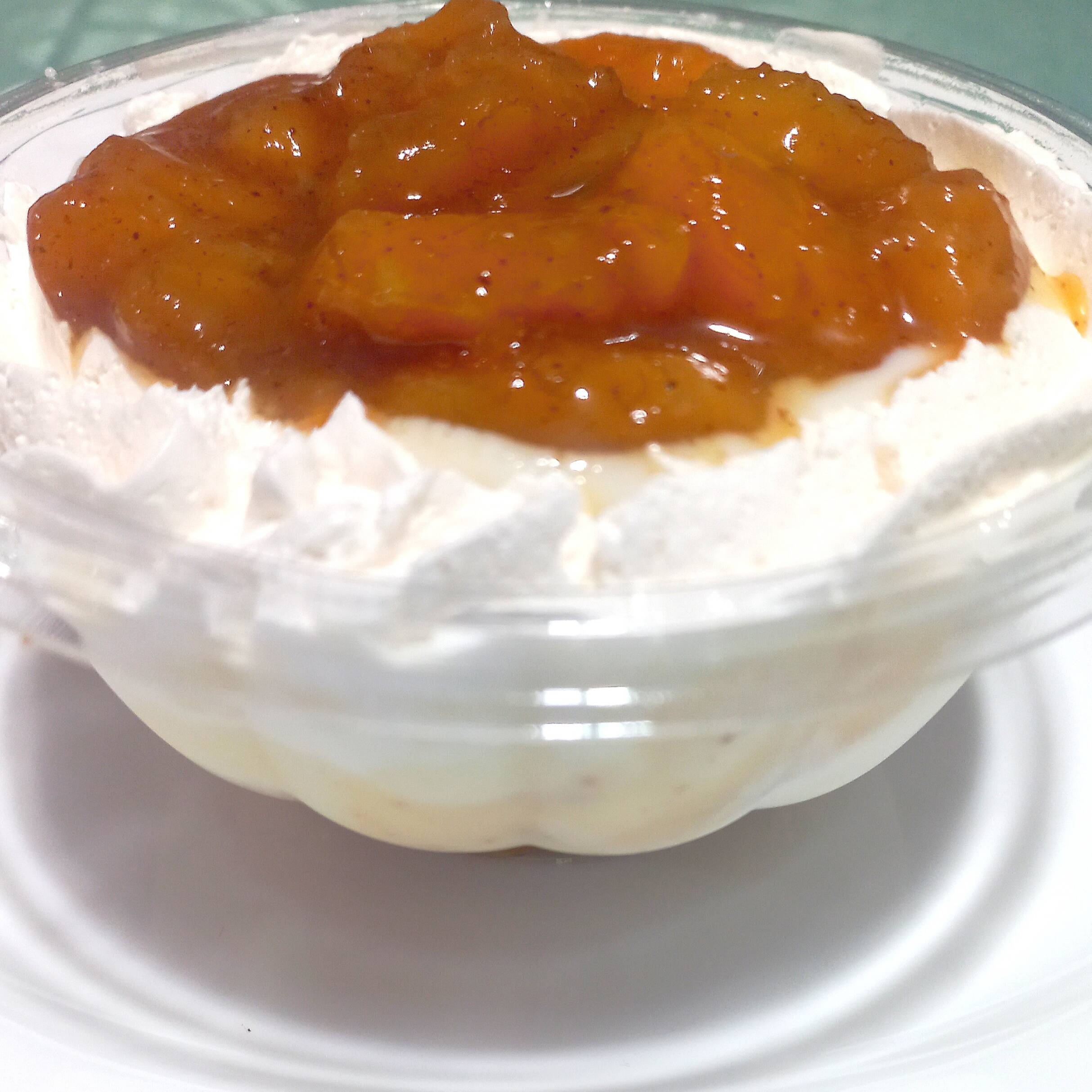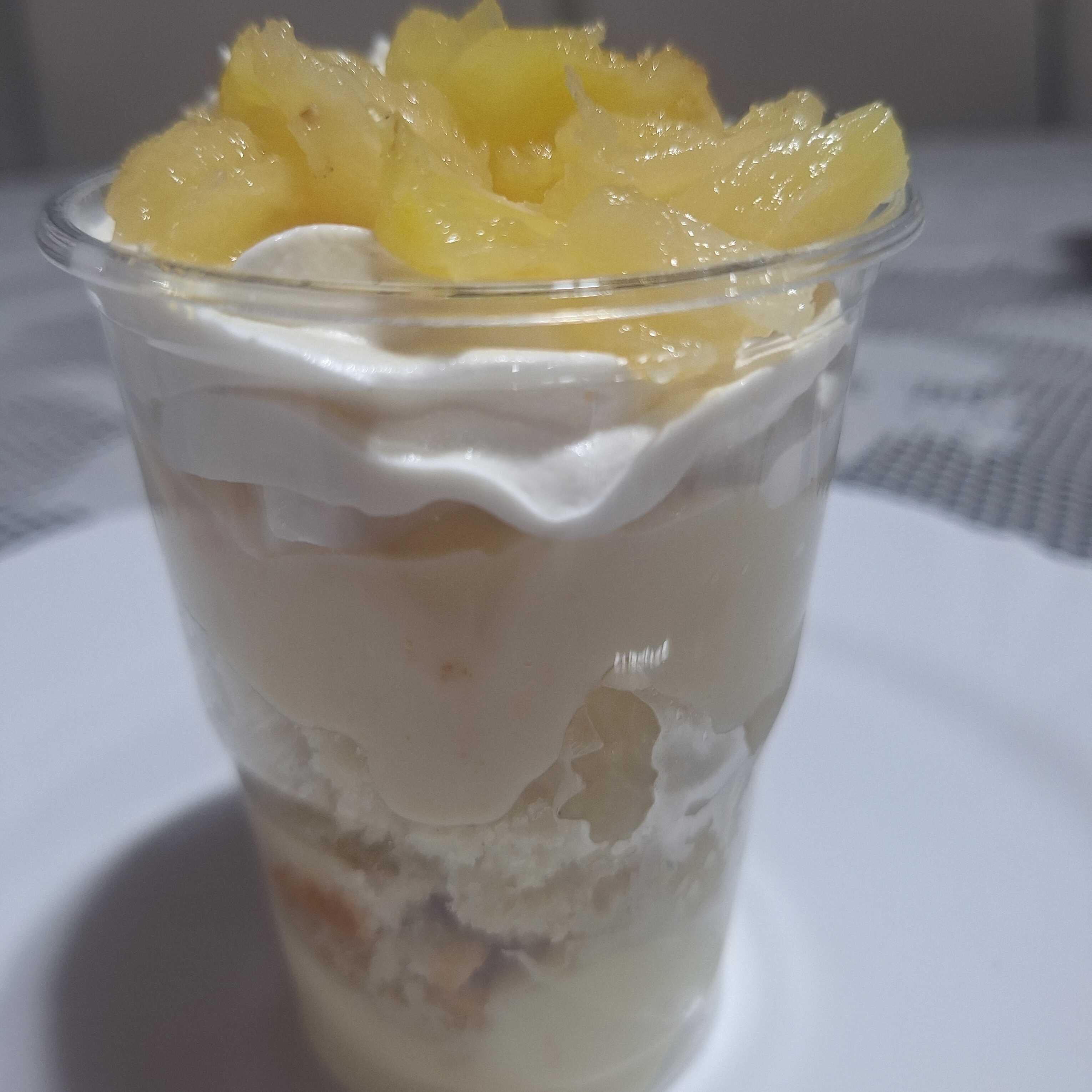 creme de baunilha, base com farelo de biscoitos, chantilly e bananas com um toque de canela