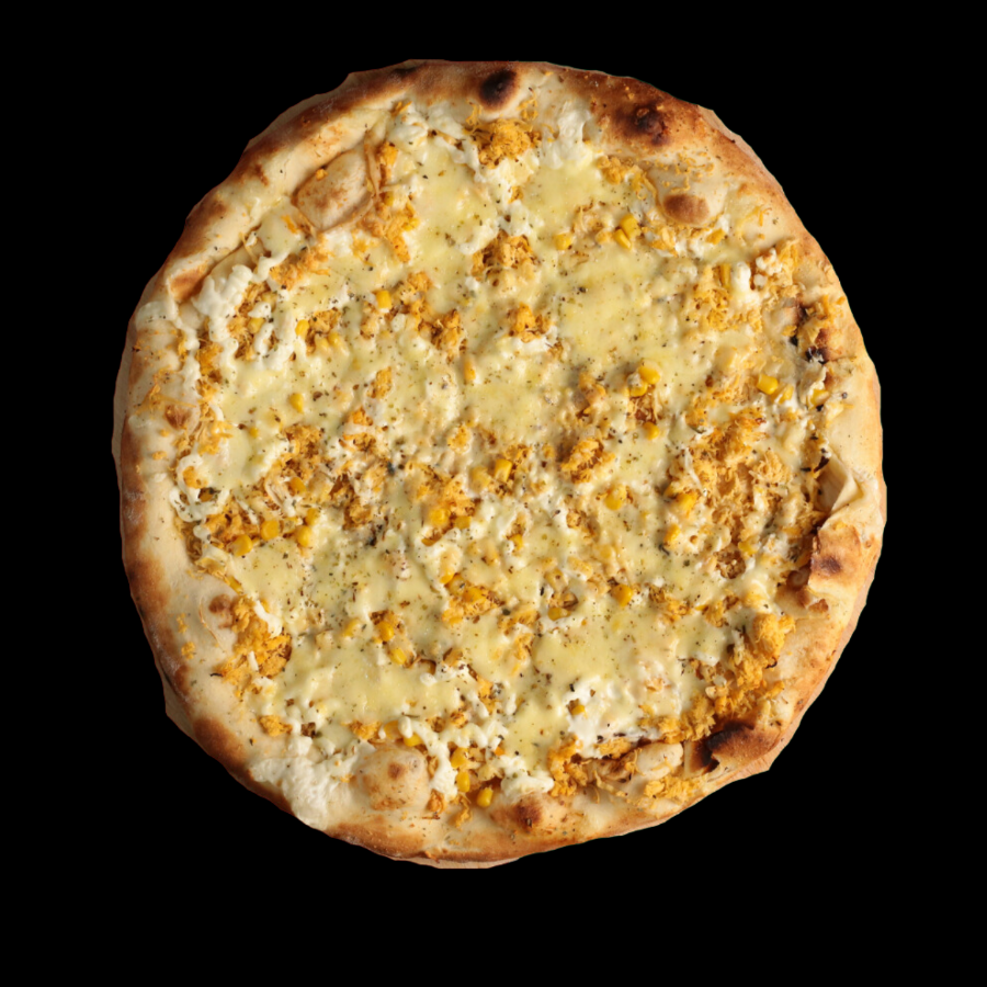Pizza Artesanal, com mussarela, frango desfiado, delicioso REQUEIJÃO sem amido, milho e oregano.
