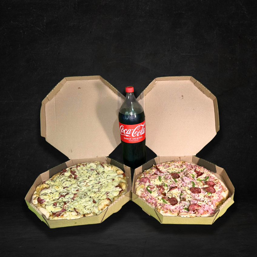 Duas pizzas de 35cm mais coca cola 2l sabores ja escolhidos.