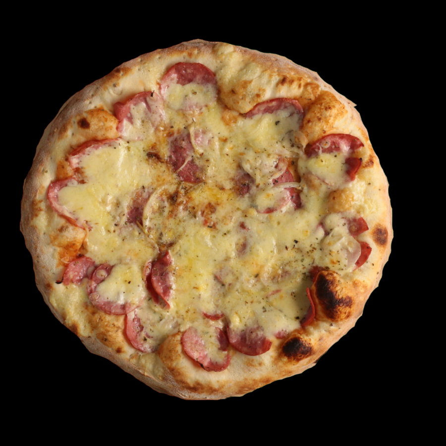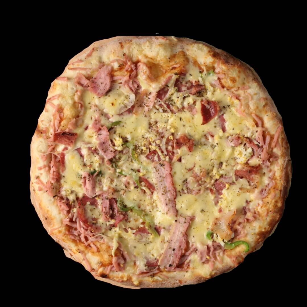 Molho De Tomate, Presunto, Mussarela, Calabresa, Bacon, Cebola, Pimentão E Oregano.