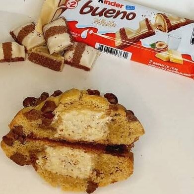 Deliciosa massa de baunilha, crocante por fora e macia por dentro, com gotas de chocolate branco e meio amargo, recheada com creme bueno e Bombom Kinder Bueno triturado.