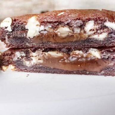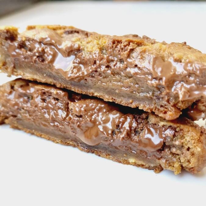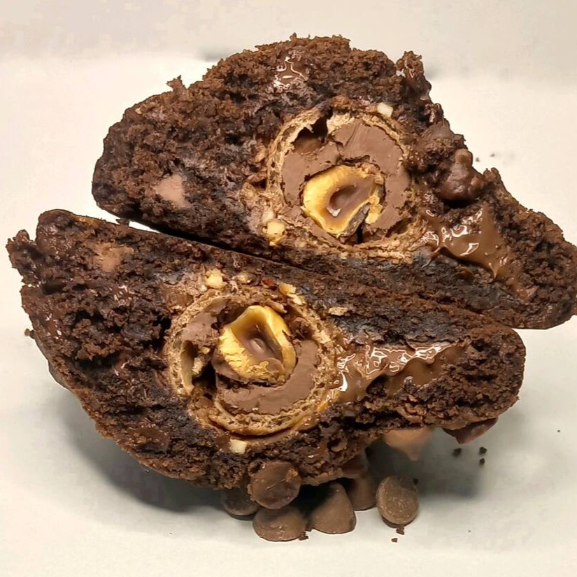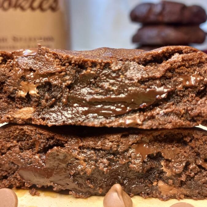 Deliciosa massa de chocolate com gotas de chocolate branco nobre, recheada com brigadeiro trufado ao leite e uma barrinha de chocolate Kinder. Experimente seu novo cookie favorito!