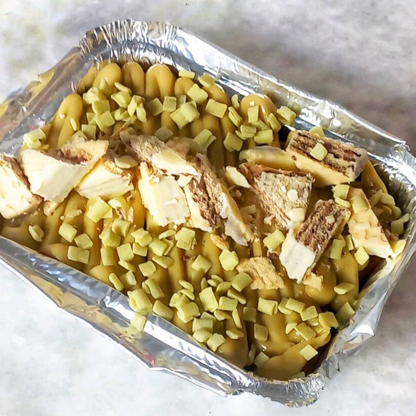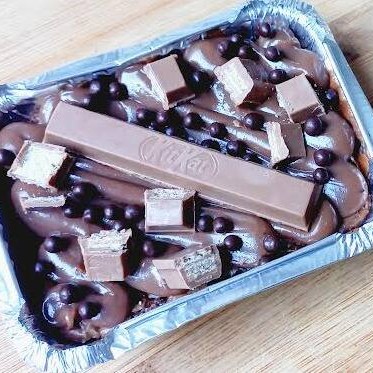 Deliciosa massa de brownie que derrete na boca coberta com uma camada de recheio de pistache confeitos de pistache e pedacinhos de Bis! Uma delícia!