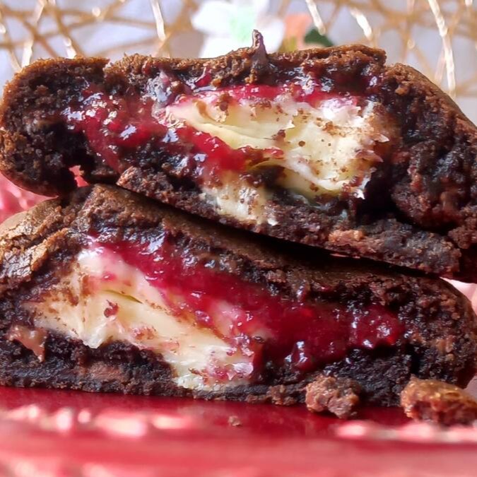 Deliciosa massa chocolatuda, crocante por fora, macia por dentro, com muitas gotas de chocolate meio amargo. O recheio vai te surpreender: um cremoso Brigadeiro de Chocolate Branco nobre e redução de Framboesas! Como toque final, flor de sal! Uma explosão de sabor!