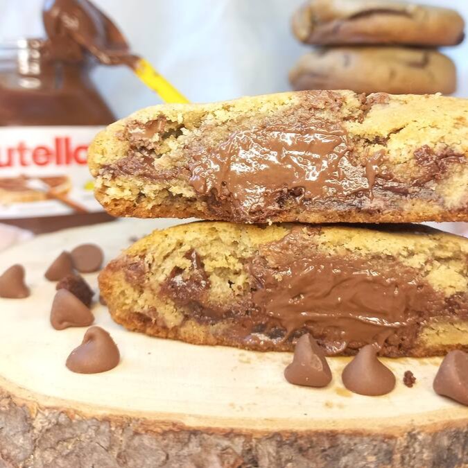 Massa manteigada de cacau e avelã, com gotas de chocolate meio amargo recheado com Nutella e bombom Ferrero!