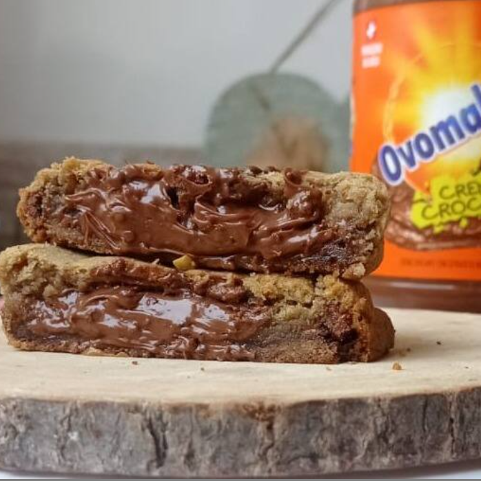 Massa de baunilha crocante por fora e macia por dentro, com gotas de chocolate ao leite e meio amargo e recheada com creme crocante de ovomaltine! (Aquecer 45 segundos no microondas)