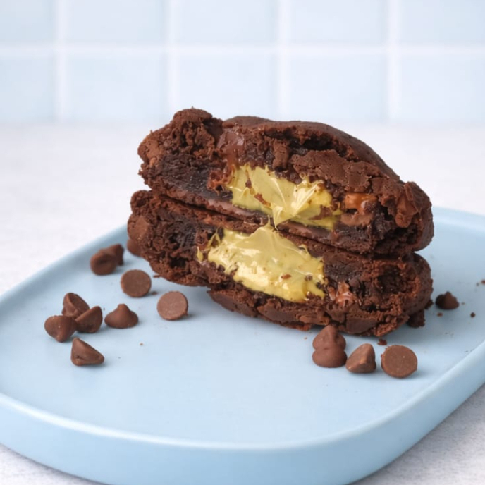 Massa amanteigada com chocolate 100% cacau, crocante por fora e macio por dentro com gotas de chocolate meio amargo e recheado com nosso novo ganache de Pistache feito com chocolate nobre. Serve 1 pessoa (100g)