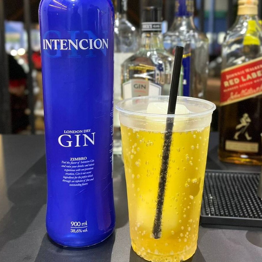 Gin Intencion + energético + gelo saborizado.