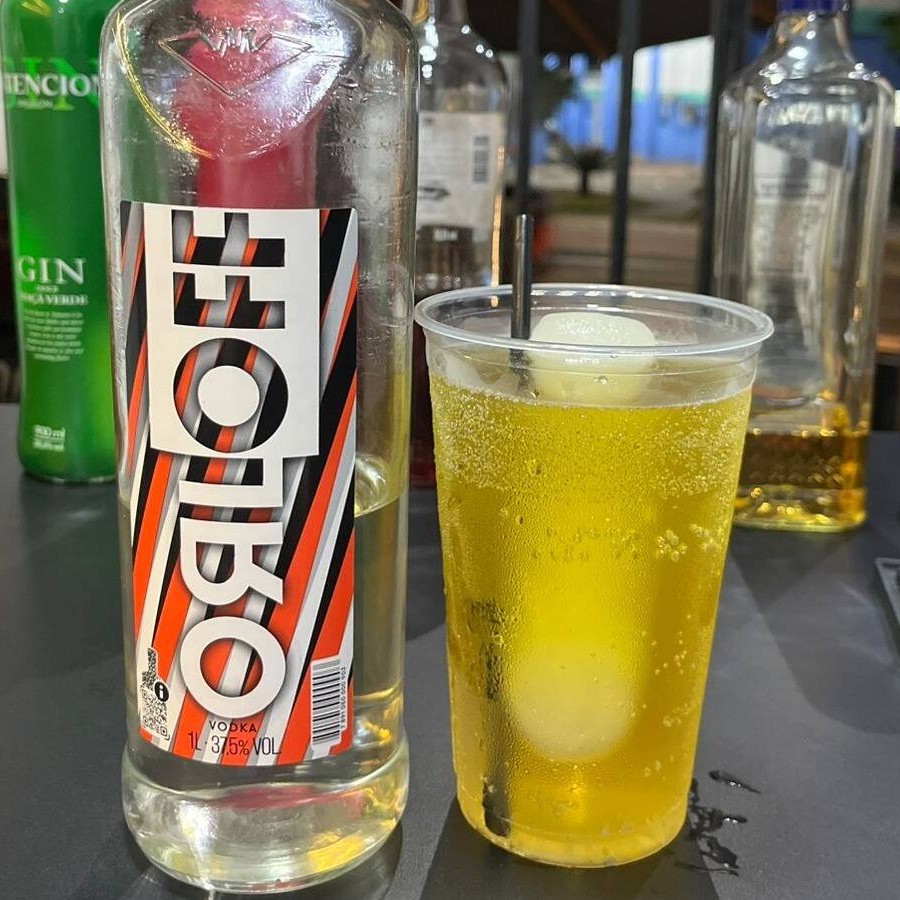 Vodka Orloff + energético + gelo saborizado.