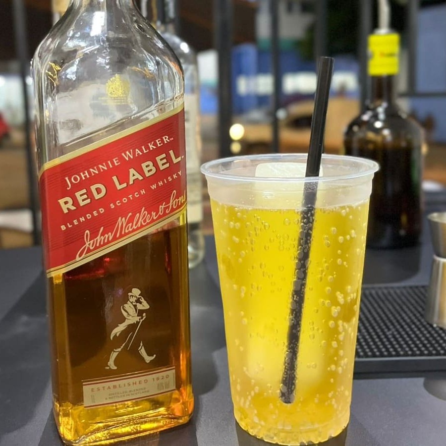 Whisky Red Label + energético + gelo saborizado.