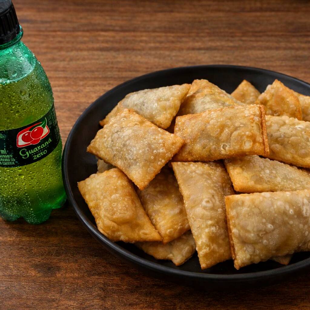 Ideal para matar aquele desejo de pastelzinho de feira bem recheado. Massa leve e frito na hora. "10 de carne e 10 de queijo". Mais um refrigerante Guaraná zero para equilibrar tudo, sem ficar com peso na consciência🥰