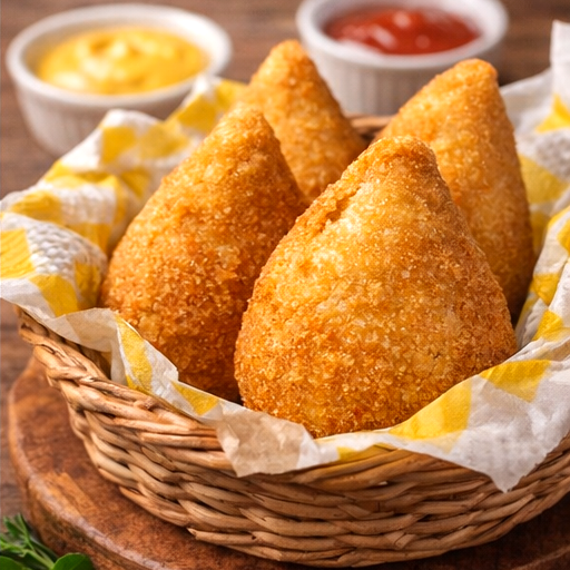 Coxinha recheada com frango desfiado e temperos especiais, envolta em uma massa crocante.