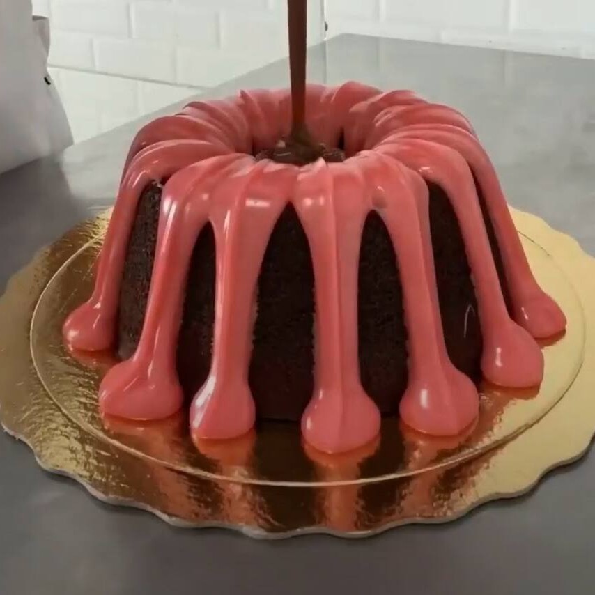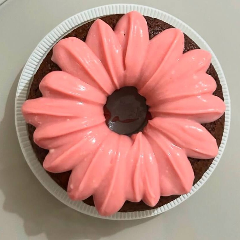 Massa macia e saborosa de chocolate com cobertura cremosa de morango.