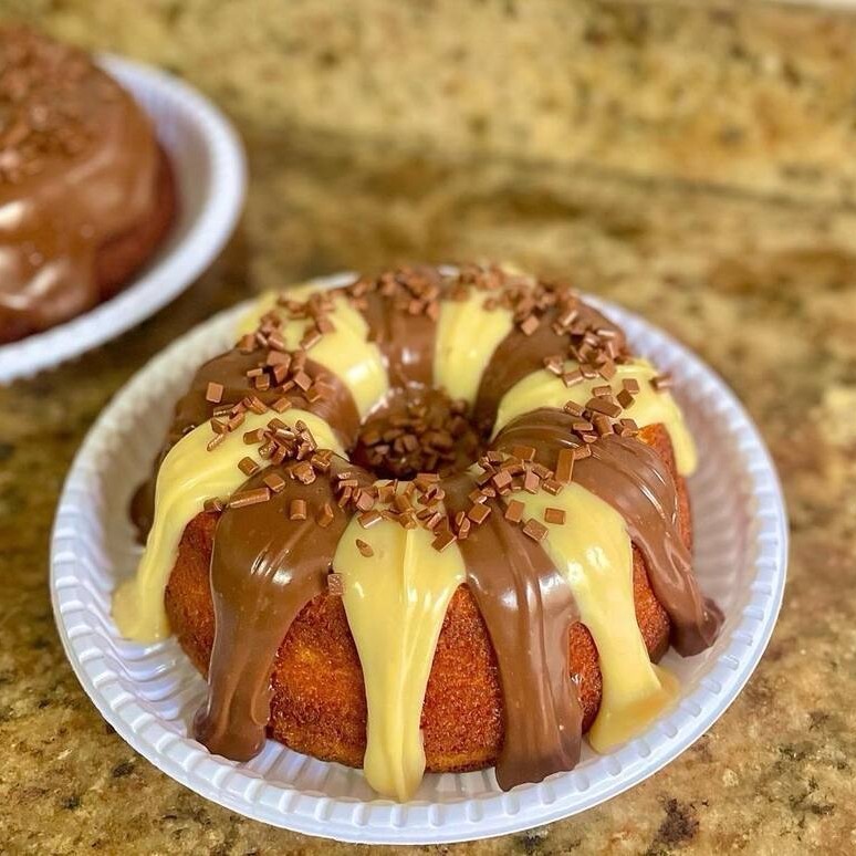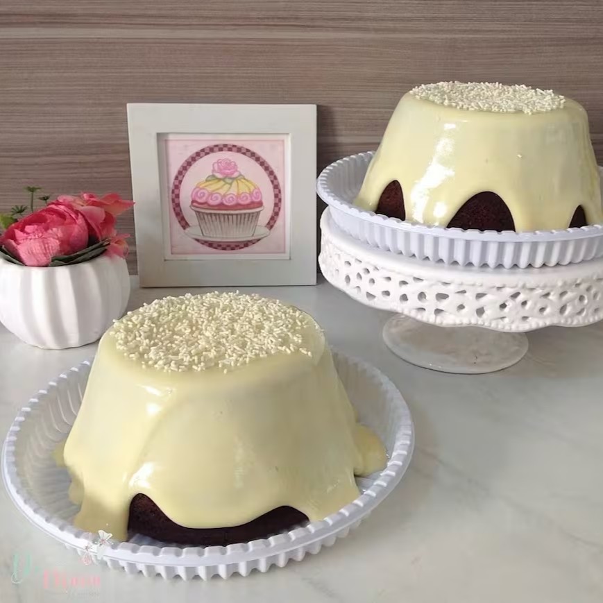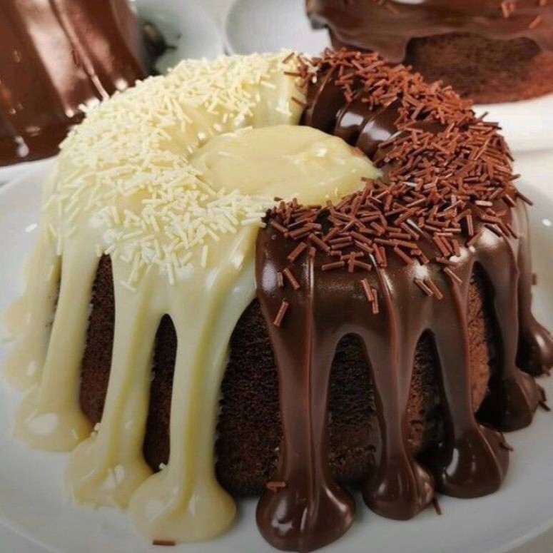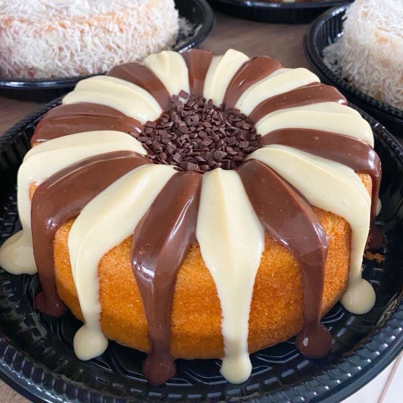 Massa fofinha de Ninho com cobertura cremosa de brigadeiro 50% cacau e brigadeiro cremoso de Ninho. Serve 10 fatias.