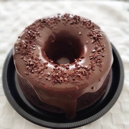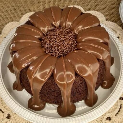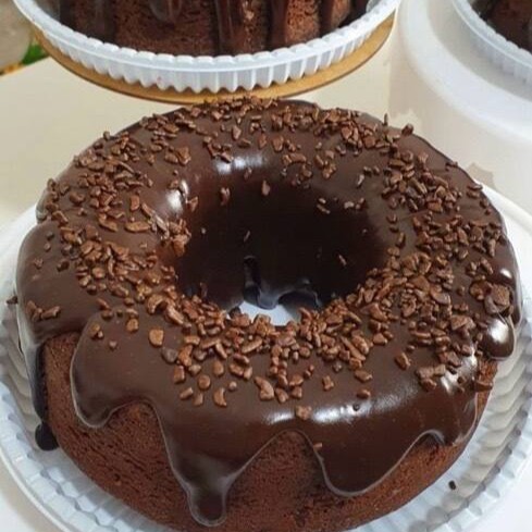 Bolo de chocolate, com cobertura de chocolate finalizado com granulado.